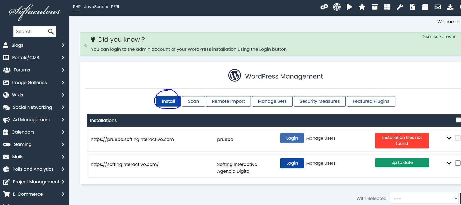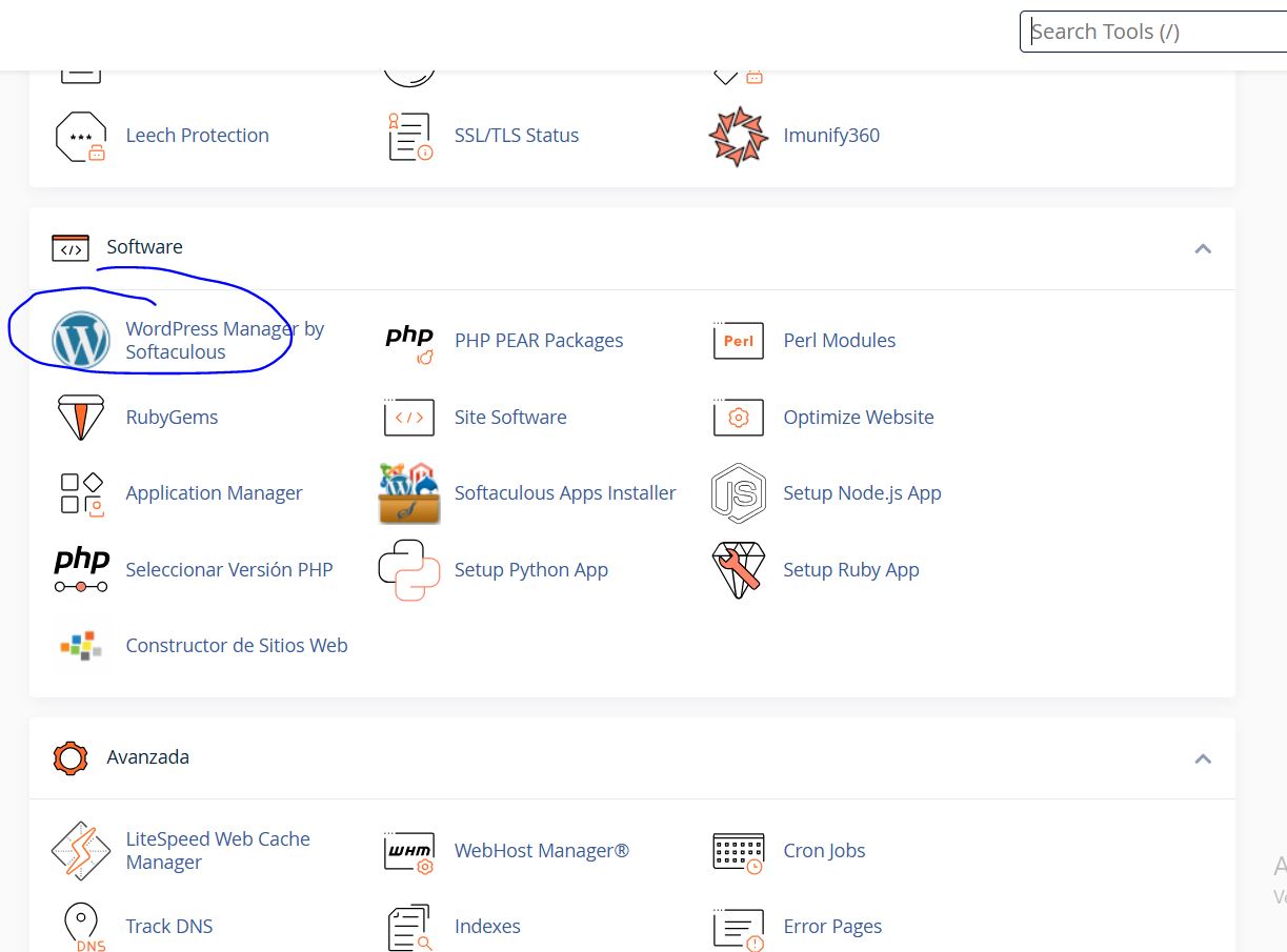 Una vez dentro, busca la sección que dice «Softaculous Apps Installer» o «Instalador de WordPress». En la mayoría de cPanel ya viene instalado.