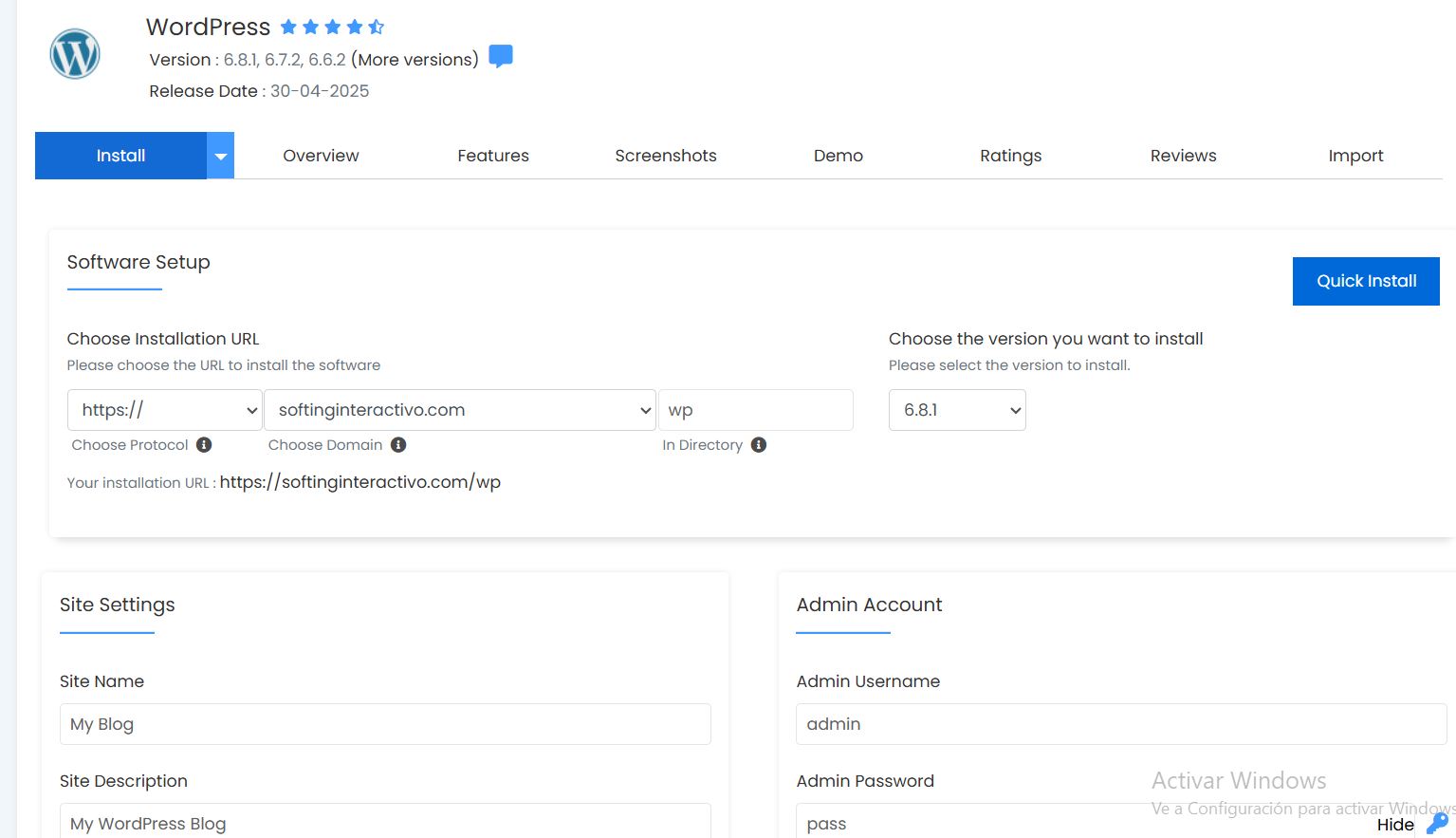 - Directorio: si quieres que se instale en la raíz (ej. tudominio.com), déjalo vacío.